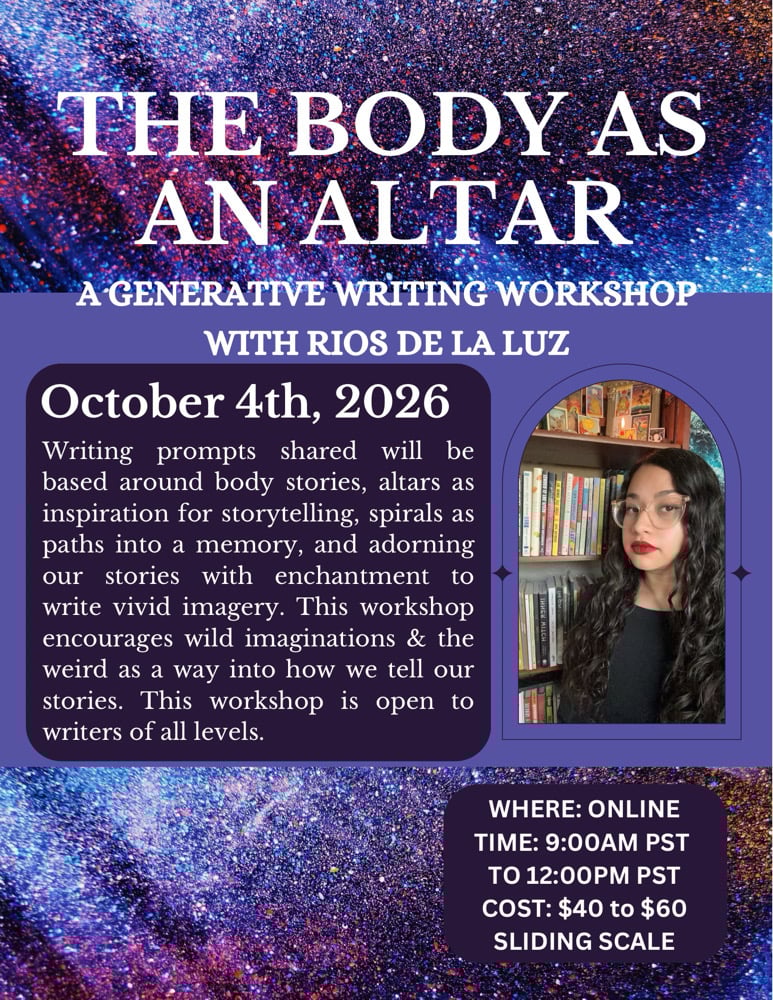 This is a 3 hour creative nonfiction generative workshop, meaning we will create together, on the spot. Writing prompts range from 7 to 15 minutes. The writing prompts shared will be based around body stories, altars as inspiration for storytelling, spirals as paths into a memory, and adorning our stories with enchantment to write vivid imagery.